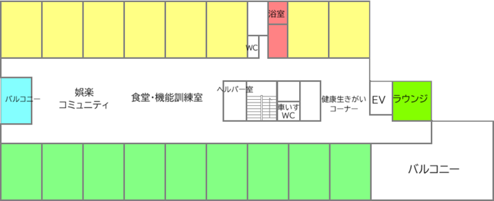 入居されている方々への食事提供や機能回復訓練、レクリエーションを行います。また、大人数が集う行事の際にはイベントホールとして使用します。食堂・機能訓練室を取り囲むように居室を配置しています。食事やレクリエーション、イベント時に長い距離を歩く必要がありませんので、高齢やご病気等により歩行が困難になった場合でも、比較的容易に居室との移動が可能です。
