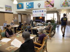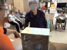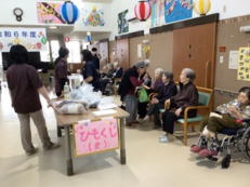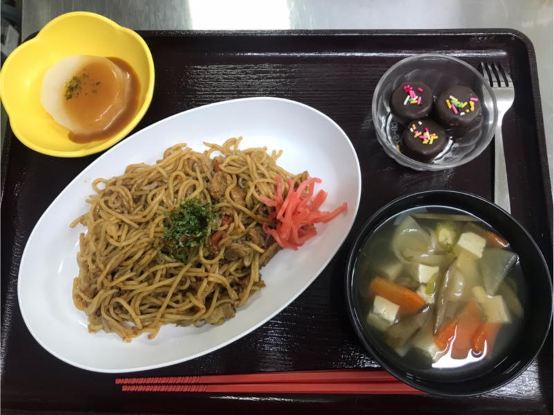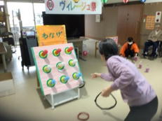 | 今年もヴィレージュ祭を行いました。「ひもくじ」「ジュースコーナー」「輪投げ」「ボーリング」「箱の中身を当てる」「ヨーヨー風船すくい」がありました。箱の中身を当てるコーナーで見事たわしを当てた方や、ひもくじで欲しかった帽子をもらって喜んでいる方、ジュースを飲みながら雑談している方、いろいろでした。ご飯を食べた後は映画を見て楽しまれていましたよ。 この日のお昼ご飯は屋台風に焼きそば、味噌大根、チョコバナナ、けんちん汁でした。 |