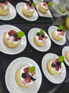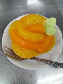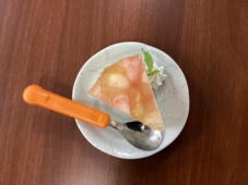 | 6月の誕生会を行いました。今日は歌を歌った後に皆さんで「てるてる坊主」を作りました。その後はお待ちかねのおやつです。今日は「黄桃と甘夏のタルト」です。美味しそう。 |