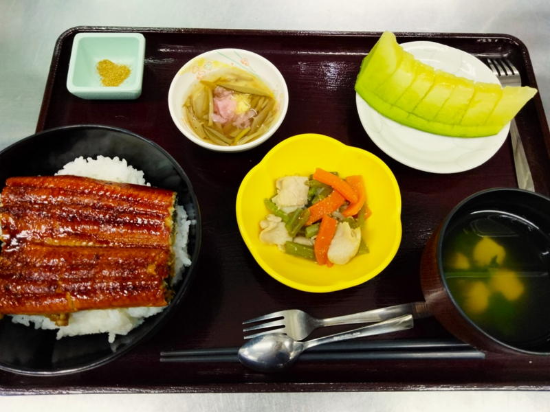 今日は土用丑の日にちなん でうな丼です。皆様より 「美味しがったー」と声が 上がっていました。 <メニュー> うな丼・ブロッコリーのサラダ・ じゅんさい・メロン・すまし汁 |