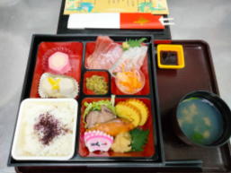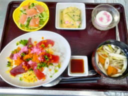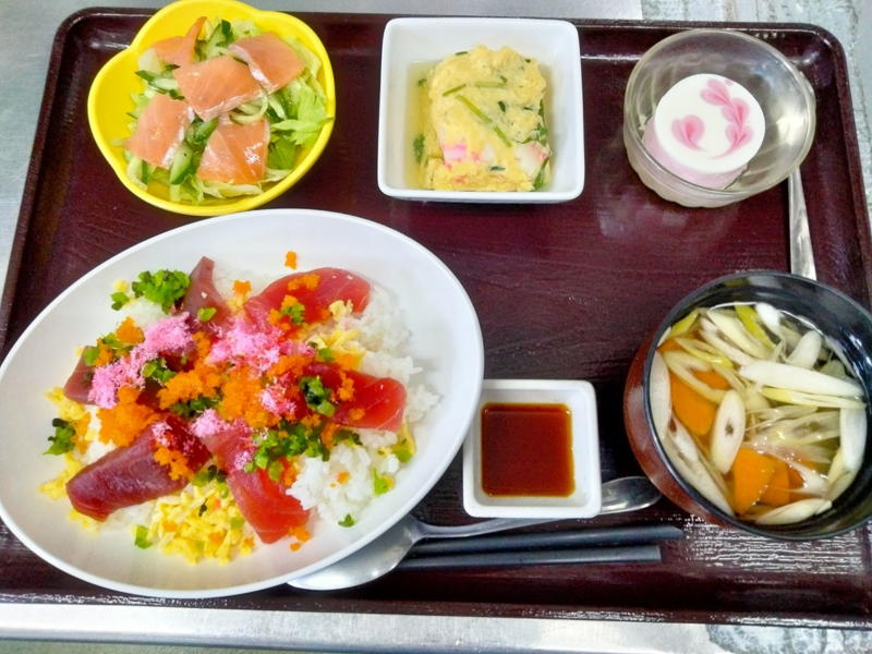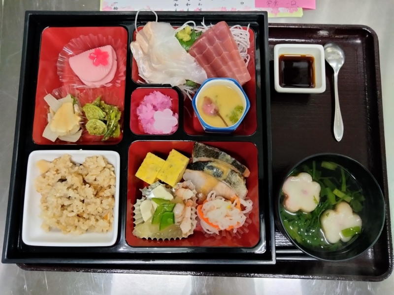 今日は行事食で「お花見御 膳」です。マグロとヒラメの お刺身、タケノコご飯、桜餅 等々あります。皆様おいしそ うに召し上がられていました よ。 |