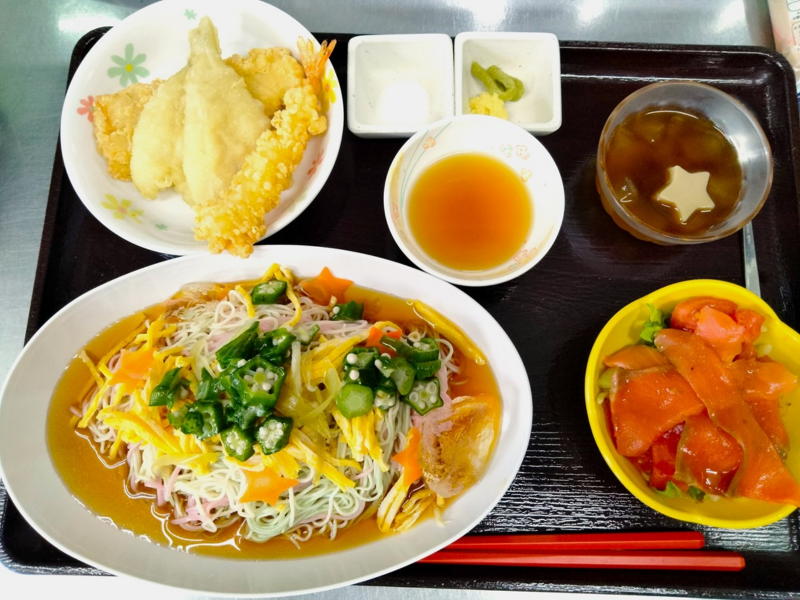 今日のお昼は七夕にちなん だ行事食です。皆様美味し そうに食べられていました よ。季節にぴったりの冷涼 を感じられて目にも華やか なメニューでした。 <メニュー> 七夕そうめん・天ぷら盛り合わ せ・サーモンサラダ・わらび餅風 デザート |