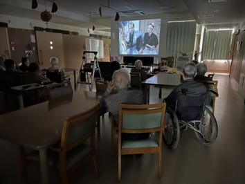 ![]() 8月誕生会は「映画観賞会」を行いました。今回の映画は「水戸黄門」です。真っ暗で本当に映画館みたいですね。あまり真っ暗で様子が分からないので、夜間モードで写した写真が下です。これだと様子が分かりますね。映画が終わった後は栄養士さん手作りの桃を使ったケーキです。皆様とても美味しそうに食べられていましたよ。 |