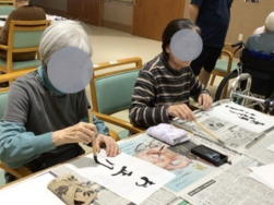 書初めを行いました。皆さん 一生懸命に書いてますね。と ても字が上手な方もいます よ。 |