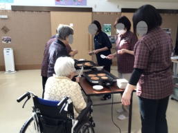 ひな祭りも楽しんでいま す。写真には見えません が、ひな人形もしっかり飾 っています。 この日はお好み焼きを職員 と一緒に作って食べまし た。 |