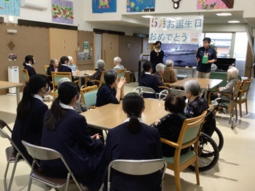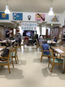 今日の誕生会ではカラオ ケ大会を行いました。計7 人の方に歌って頂きまし た。感極まって泣く方、 アカペラで歌う方、プロ 並みにうまい方、様々に 楽しんでいただきまし た。 |