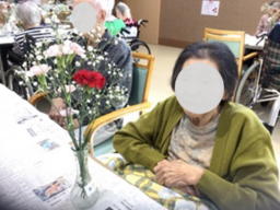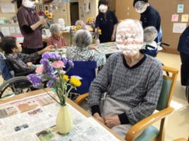 お昼を頂いた後、フラワー アレンジメントを行いまし た。皆様一生懸命きれいに 飾られていましたよ。その 後職員と皆様で秋田県民歌 を熱唱しました。 |