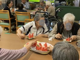 今日はスイカ割りの日でし た。入居者代表が見事に割 ったスイカを皆さんで頂い ています。食べきれずに職 員もおいしく頂きました。 |