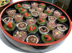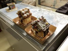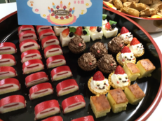 | ちょっと早いのですが、クリスマス会を行いました。今年も恒例の職員によるハンドベルや歌を行いました。なかなか全員で練習する機会は少なかったのですが、本番は大成功でした。上の写真はケーキバイキングです。写真では2皿ですが、全部で5皿ありました。また、厨房の方が作ってくれたお菓子の家(なんと全部食べれます!)もあります。 |