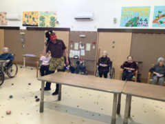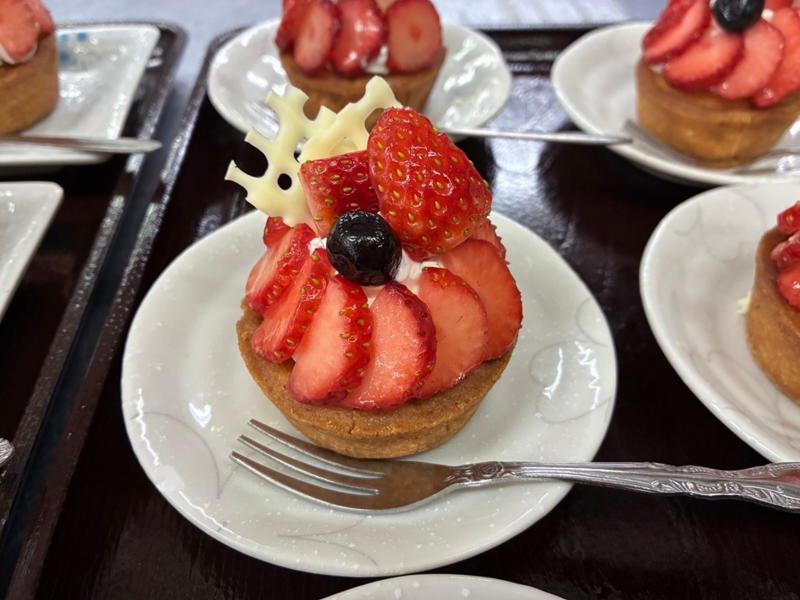 | 2月誕生会です。写真では見づらいですがシクラメンを作成しています。認知症の入居者ですが職員と一緒に楽しみながら作成しています。誕生ケーキはいちごのタルトです。もちろんヴィレージュの栄養士さんの手作りです!とても美味しそうですね。 |