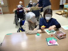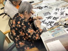 | 今年も書初めを行いました。今年は皆様とても生き生きしていて意外な一面を見せてくれた入居者様もいました。これを機に字の練習をしたいと希望された入居者様もいて嬉しい限りです。 |